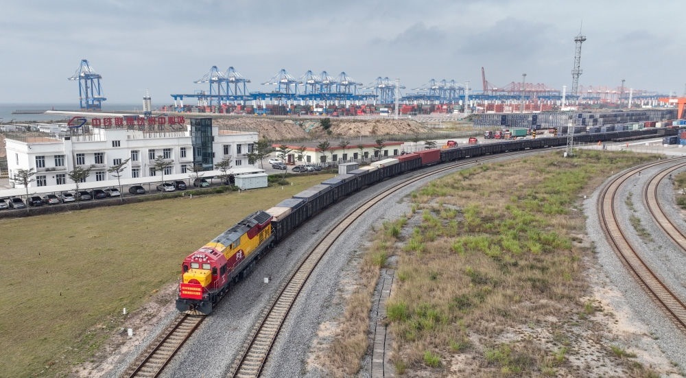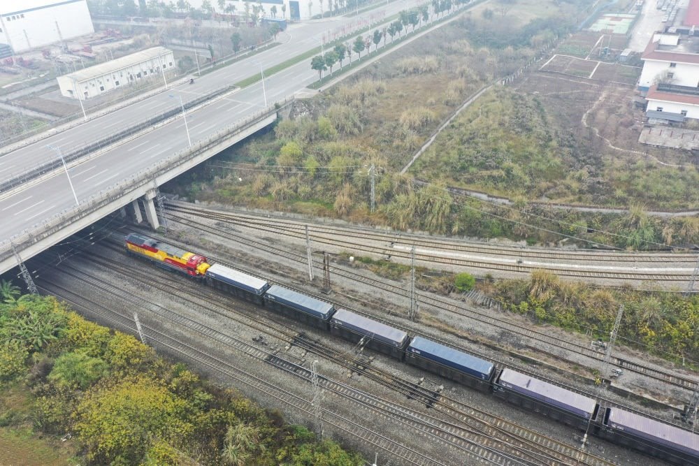 2023年1月22日,一趟西部陸海新通道鐵海聯(lián)運(yùn)班列從重慶團(tuán)結(jié)村中心站發(fā)車(無人機(jī)照片)。班列滿載著汽車、摩托車、發(fā)動機(jī)和純堿等共計100個集裝箱的貨物,將經(jīng)廣西欽州港換乘海船去往印度尼西亞、菲律賓、喀麥隆、澳大利亞等國家和地區(qū)。