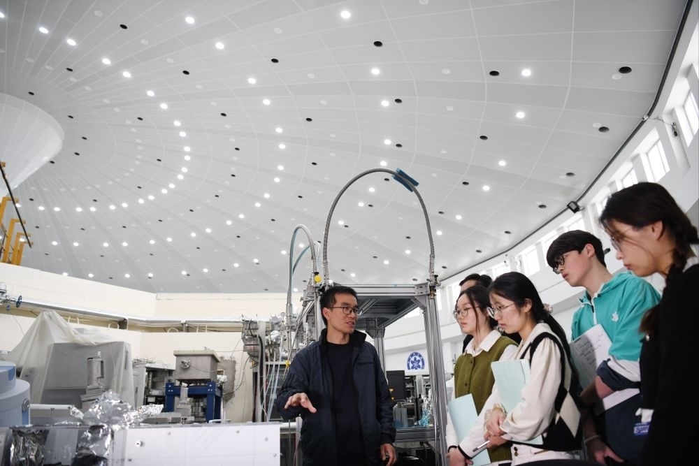 在中國(guó)科學(xué)技術(shù)大學(xué)國(guó)家同步輻射實(shí)驗(yàn)室,安徽省先進(jìn)功能高分子薄膜工程實(shí)驗(yàn)室團(tuán)隊(duì)成員崔昆朋教授(左一)同學(xué)生交流(2024年4月6日攝)。新華社記者 張端 攝
