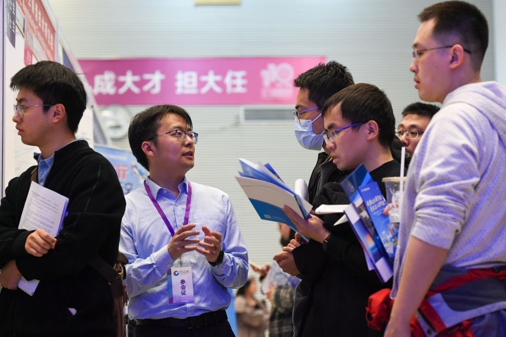 在清華大學(xué)舉辦的2024屆畢業(yè)生大型就業(yè)洽談會(huì)上,一名用人單位招聘人員(左二)與求職畢業(yè)生交流(2024年3月15日攝)。新華社記者 鞠煥宗 攝