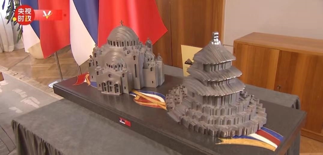 這份禮物是北京天壇和貝爾格萊德圣薩瓦教堂造型的鋼制工藝品,由中國河鋼集團斯梅戴雷沃鋼廠生產(chǎn)的鋼材制成。望著這份禮物,習(xí)主席風(fēng)趣地說,是“鋼桿”朋友了。
