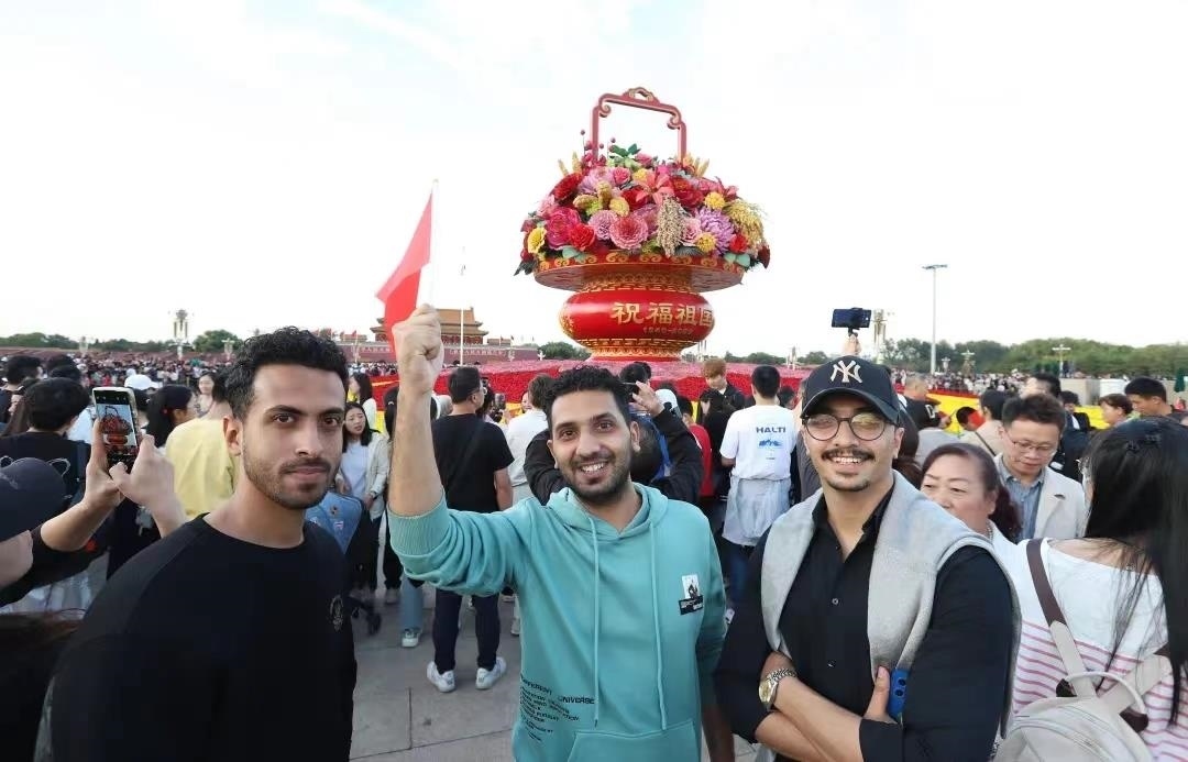 △2023年10月1日,三位來自阿爾及利亞的游客在北京天安門廣場(chǎng)“祝福祖國(guó)”巨型花籃前留影。