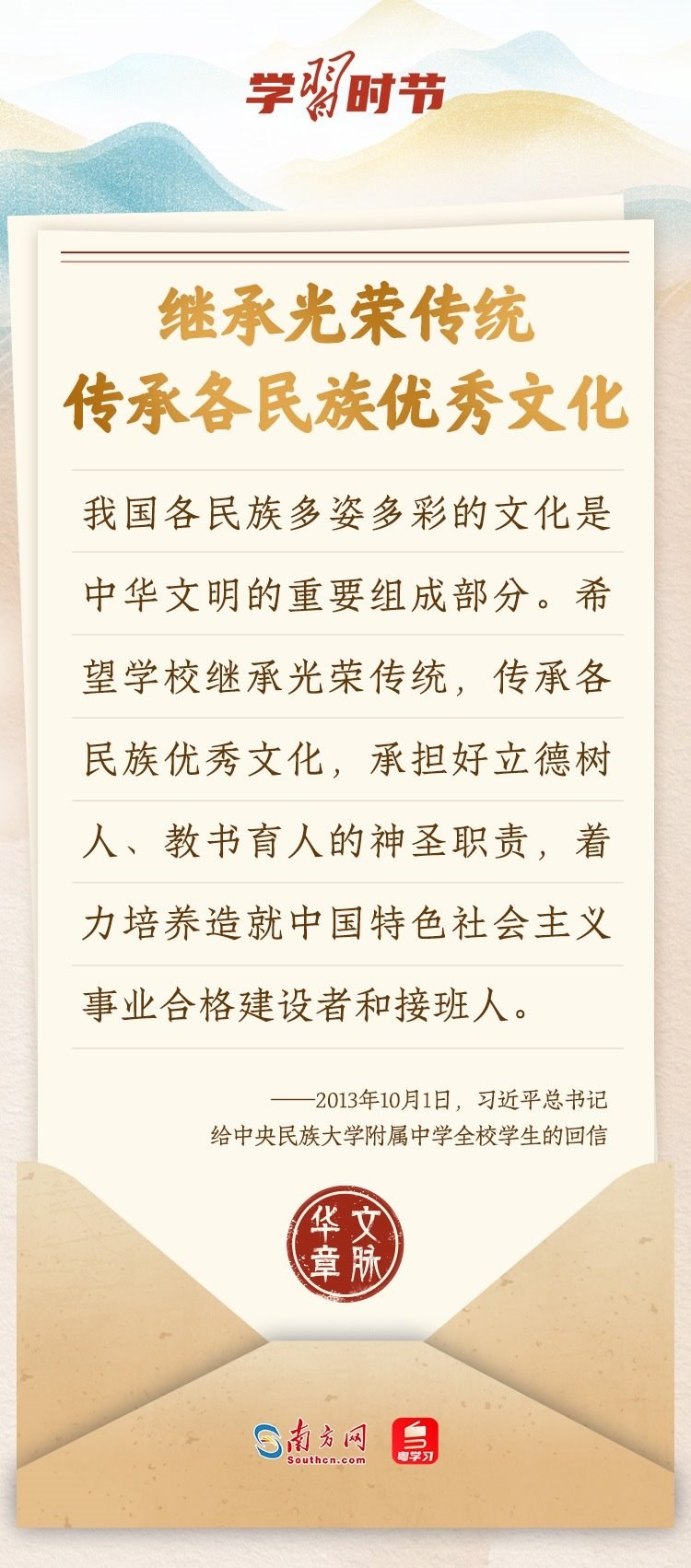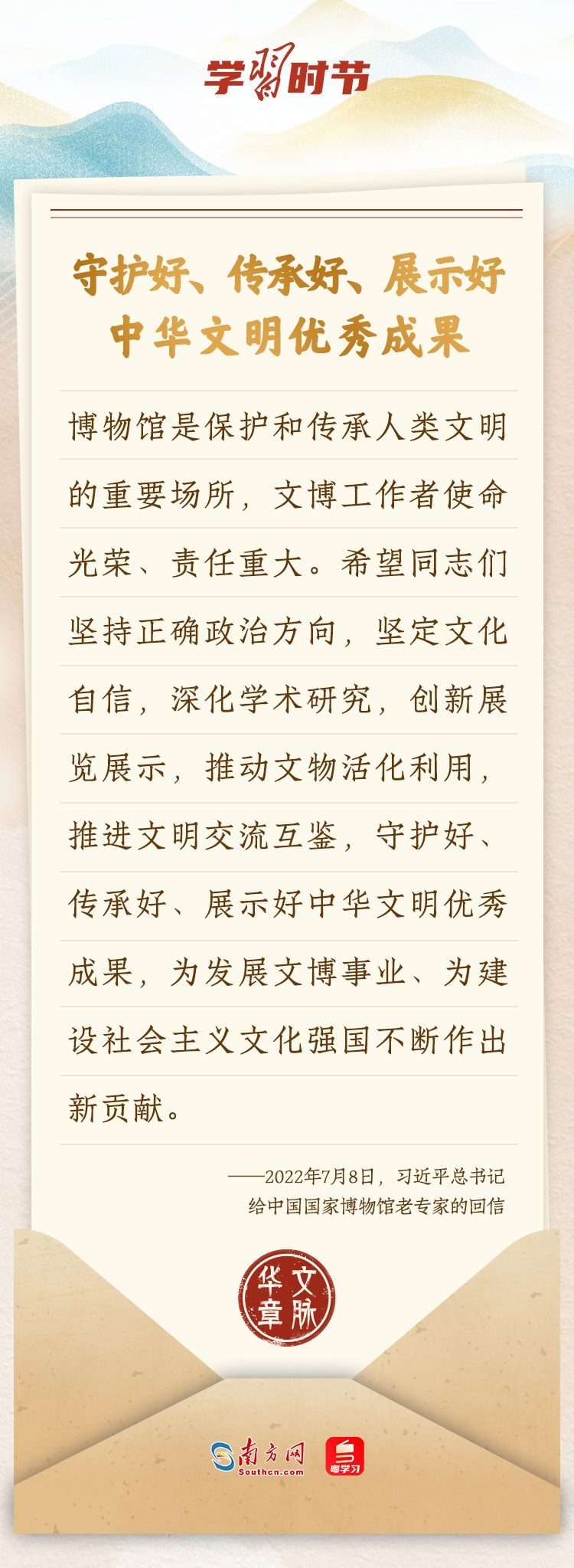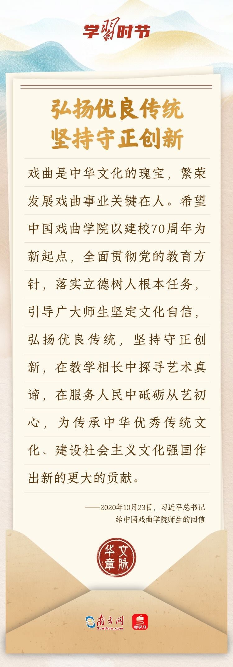 “中華民族在幾千年歷史中創(chuàng)造和延續(xù)的中華優(yōu)秀傳統(tǒng)文化,是中華民族的根和魂?!绷?xí)近平總書記多次通過發(fā)賀信、寫回信等方式,表達著對弘揚中華優(yōu)秀傳統(tǒng)文化的殷切希望,飽含深情、字字暖心、催人奮進。讓我們一起“讀”信。
