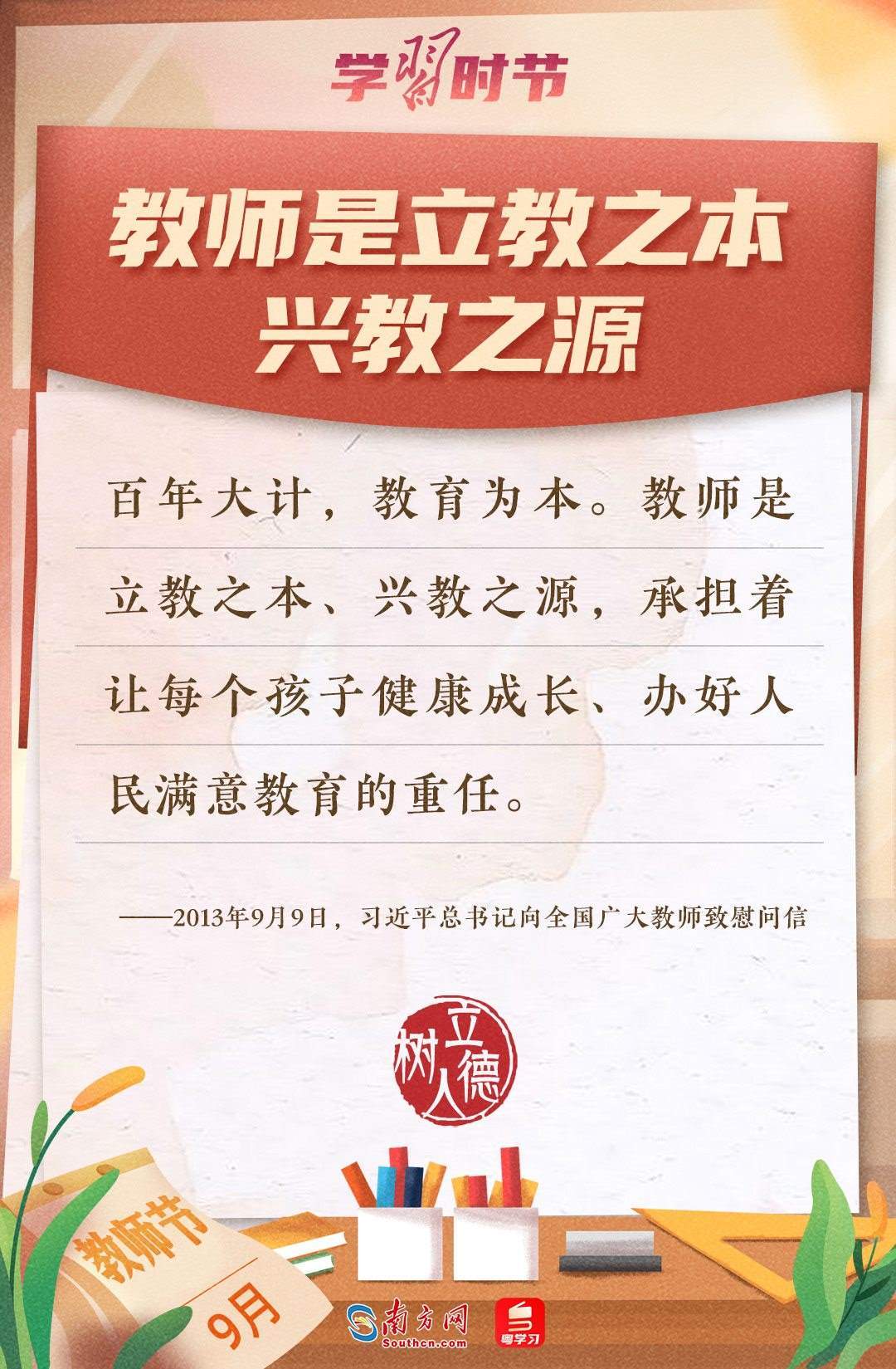 “百年大計(jì),教育為本。教育大計(jì),教師為本?!秉h的十八大以來(lái),習(xí)近平總書(shū)記多次以書(shū)信形式向教師群體和教育工作者表達(dá)囑托與期望,諄諄話語(yǔ),催人奮進(jìn)。在第四十個(gè)教師節(jié)到來(lái)之際,讓我們一起重溫總書(shū)記的諄諄寄語(yǔ)!