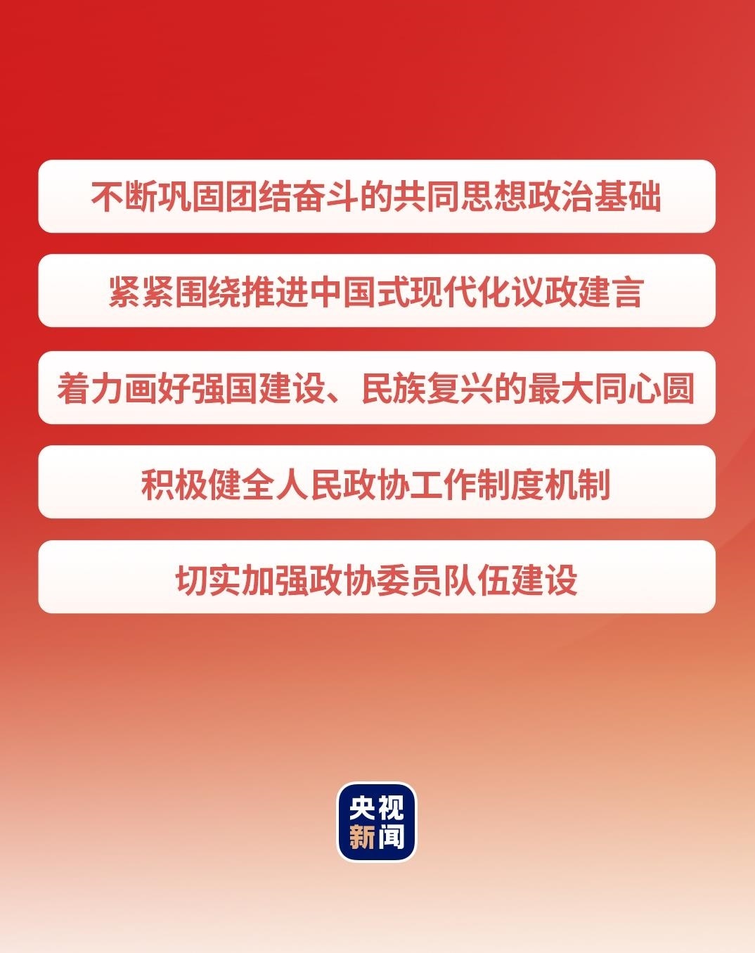 在這次慶祝大會上,習近平總書記從5個方面提出要求,寄望人民政協(xié)發(fā)揚優(yōu)良傳統(tǒng),牢記政治責任,堅持黨的領(lǐng)導、統(tǒng)一戰(zhàn)線、協(xié)商民主有機結(jié)合,充分發(fā)揮專門協(xié)商機構(gòu)作用,為推進中國式現(xiàn)代化廣泛凝聚人心、凝聚共識、凝聚智慧、凝聚力量。