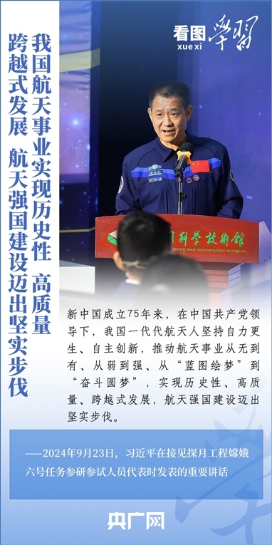 中國(guó)探月工程成果凝結(jié)著我國(guó)幾代航天人的智慧和心血。9月23日,習(xí)近平總書記接見探月工程嫦娥六號(hào)任務(wù)參研參試人員代表并發(fā)表重要講話??倳浉叨瓤隙ㄦ隙鹆?hào)任務(wù)成功的重要意義,以及探月工程為我國(guó)航天事業(yè)發(fā)展、為人類探索宇宙空間作出的重大貢獻(xiàn),勉勵(lì)航天戰(zhàn)線工作者再接再厲、乘勢(shì)而上,為建設(shè)航天強(qiáng)國(guó)再立新功。一起來學(xué)習(xí)!