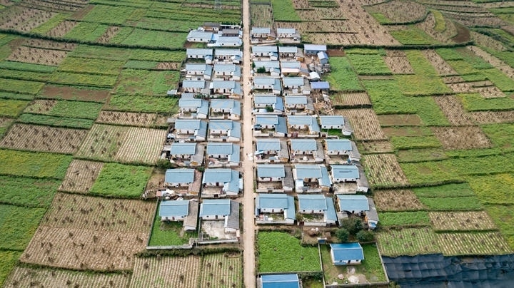 俯瞰四川省昭覺縣地莫鄉(xiāng)地莫村田園中的新居(2020年10月10日攝,無人機照片)。新華社記者 張笑宇 攝