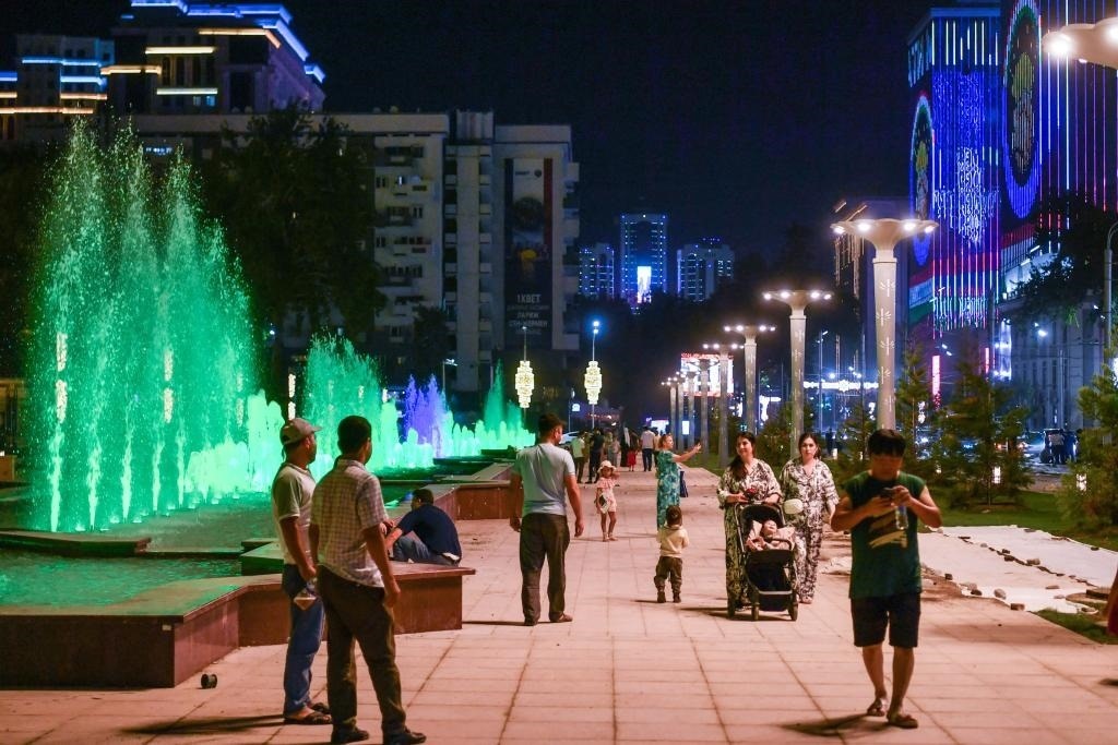 6月25日,在塔吉克斯坦首都杜尚別街頭,入夜后當(dāng)?shù)鼐用駧е⒆酉罴{涼。