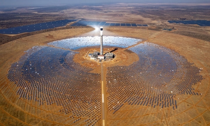 這是2024年8月20日在南非北開(kāi)普省拍攝的南非紅石100兆瓦塔式熔鹽光熱電站項(xiàng)目(無(wú)人機(jī)照片)。 新華社記者 張譽(yù)東 攝