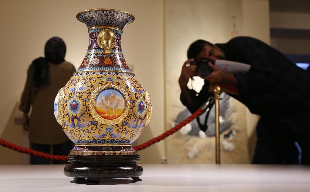 2024年10月12日,在伊朗首都德黑蘭的馬利克國家博物館,觀眾在“絲路長云——中國藝術(shù)文化精品展”現(xiàn)場(chǎng)拍攝展品。新華社記者 沙達(dá)提 攝