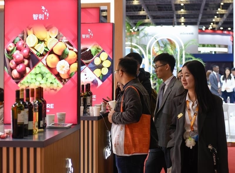 △2024年11月7日,觀眾在第七屆進(jìn)博會(huì)國(guó)家展上的智利館了解智利紅酒。