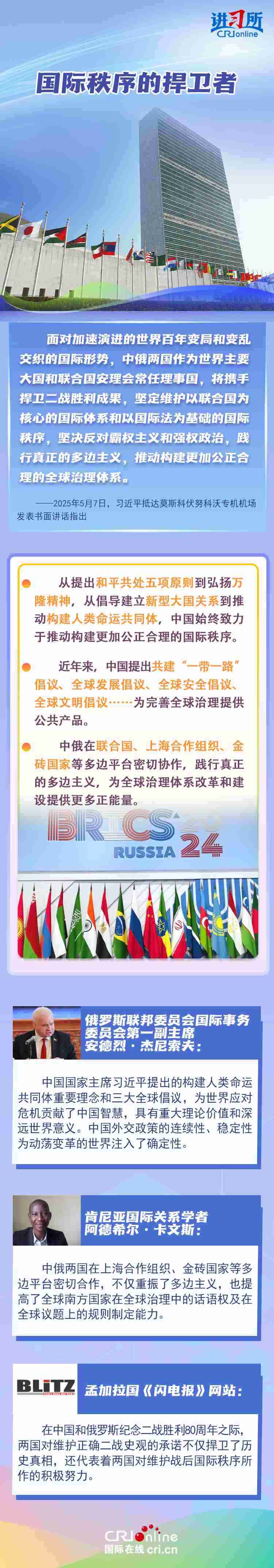 “兩國人民用鮮血和生命凝結的深厚情誼,如黃河之水奔騰不息,似伏爾加河寬廣深沉,成為中俄世代友好的不竭源泉?!苯衲晔侵袊嗣窨谷諔?zhàn)爭、蘇聯(lián)偉大衛(wèi)國戰(zhàn)爭暨世界反法西斯戰(zhàn)爭勝利80周年,也是聯(lián)合國成立80周年。在這一重要歷史時間節(jié)點,習近平主席此訪不僅為中俄關系發(fā)展注入強勁動力,也向世界宣示中俄兩國攜手捍衛(wèi)二戰(zhàn)勝利成果的堅定意志。