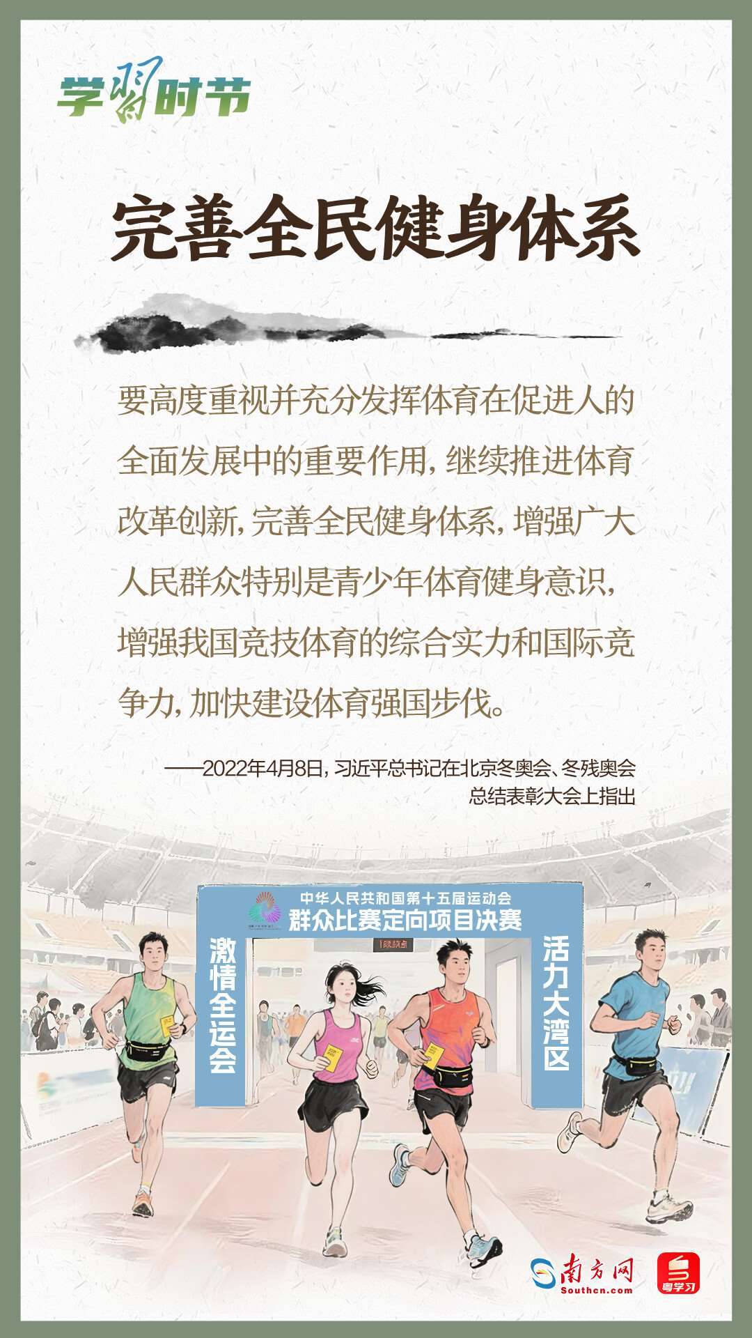 今年5月17日拉開帷幕的第十一屆全民營養(yǎng)周,以“吃動平衡 健康體重 全民行動”為主題,向全社會傳遞運動和飲食在健康生活中同等重要的理念。而今年11月至12月由粵港澳三地共同承辦的十五運會和殘?zhí)貖W會,充分發(fā)揮賽事的“全民性”,將群眾體育發(fā)展推向新高度。