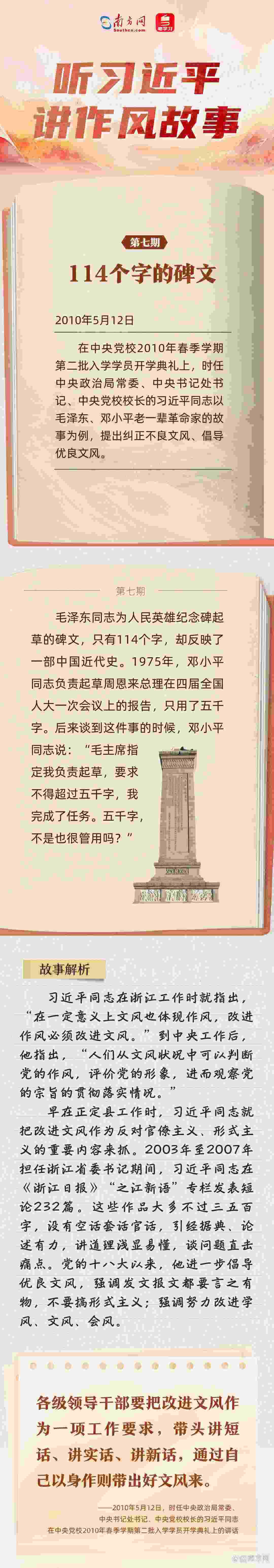 當前,全黨上下正在開展深入貫徹中央八項規(guī)定精神學習教育,縱深推進作風建設。關于作風建設,習近平總書記常用講故事的方式,傳達深意、感染他人,給人以思想啟迪。南方網(wǎng)、粵學習客戶端推出“聽習近平講作風故事”系列報道,與您一起感悟這些故事蘊含的深刻道理。 今天,推出《聽習近平講作風故事⑦丨114個字的碑文》,與您一起學習毛澤東、鄧小平老一輩革命家的文風。