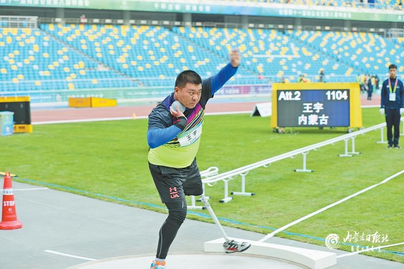 內(nèi)蒙古肢體殘疾運(yùn)動(dòng)員王宇在鉛球比賽上的投球瞬間。