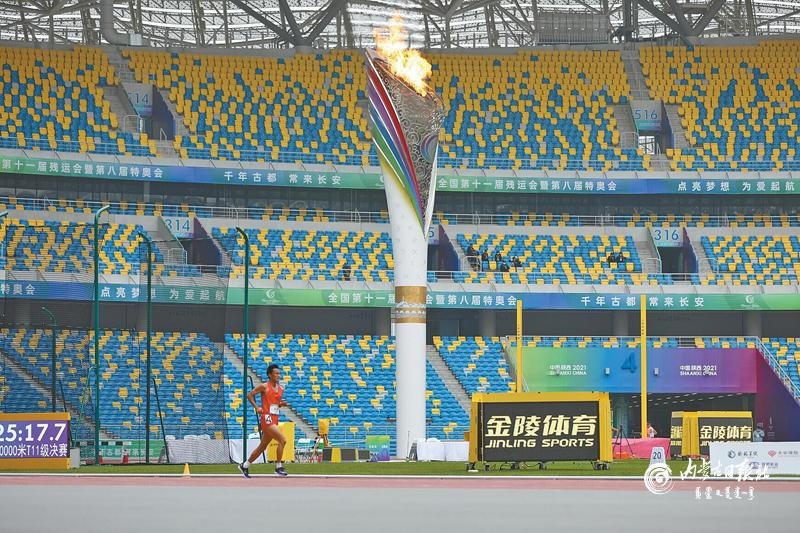 10 月23 日,男子t11 級(jí)10000米的賽場(chǎng)上,內(nèi)蒙古運(yùn)動(dòng)員孟可在沒有領(lǐng)跑員的不利條件下,依然堅(jiān)持跑完了全程。