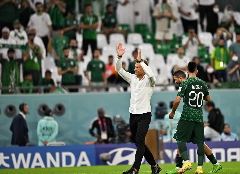 11月26日,沙特阿拉伯隊主教練勒納爾(左)賽后向觀眾致意。新華社記者 辛悅衛(wèi) 攝