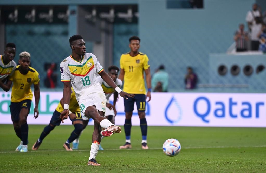 11月29日,塞內(nèi)加爾隊(duì)球員伊斯梅拉·薩爾(前)在比賽中主罰點(diǎn)球破門(mén)。新華社記者 陳誠(chéng) 攝