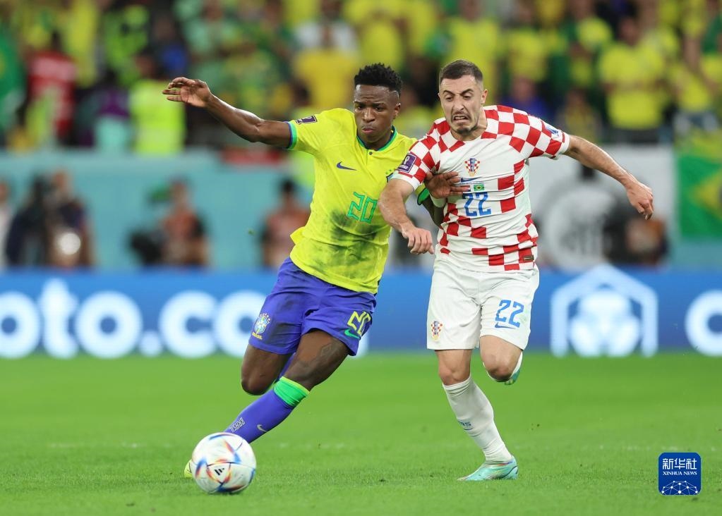 12月9日,巴西隊(duì)球員維尼修斯(左)與克羅地亞隊(duì)球員尤拉諾維奇在比賽中拼搶。新華社記者 李明 攝