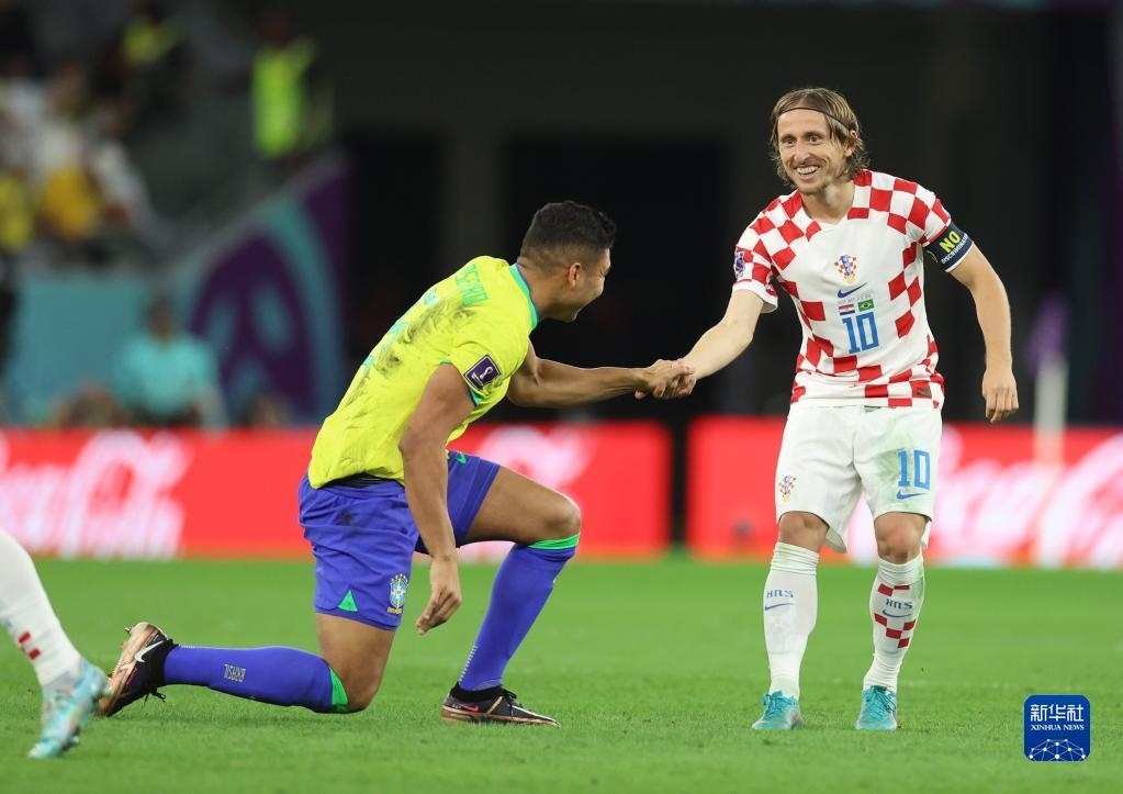 12月9日,克羅地亞隊(duì)球員莫德里奇(右)在比賽中扶起巴西隊(duì)球員卡塞米羅。新華社記者 李明 攝