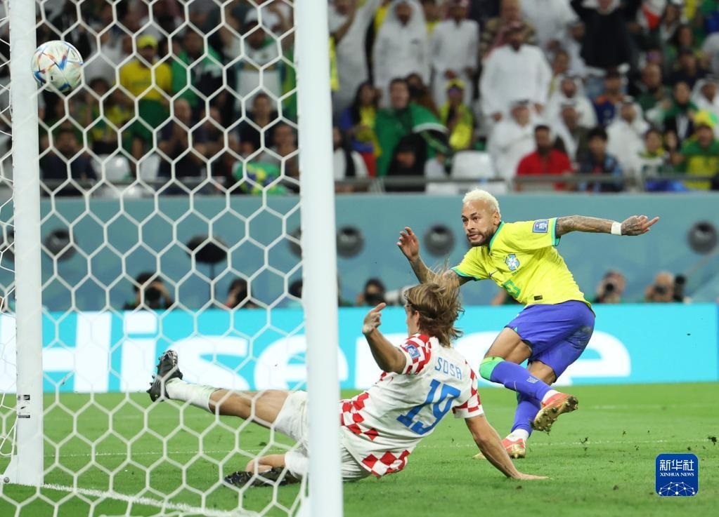 12月9日,巴西隊(duì)球員內(nèi)馬爾(右二)在比賽中突破克羅地亞隊(duì)守門員利瓦科維奇(右三)的防守后射門得分。新華社記者 蘭紅光 攝