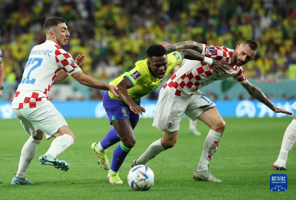 12月9日,巴西隊(duì)球員維尼修斯(中)與克羅地亞隊(duì)球員尤拉諾維奇(左)、布羅佐維奇在比賽中拼搶。新華社記者 李明 攝