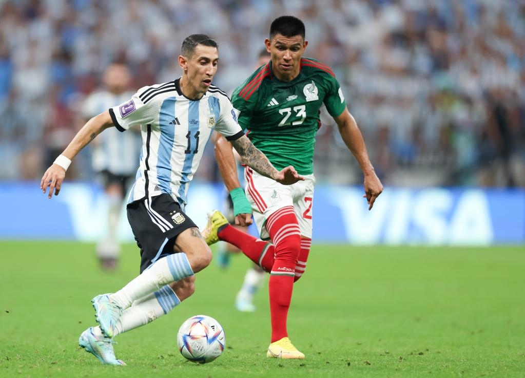 11月26日,阿根廷隊球員迪瑪利亞(左)在對陣墨西哥隊的比賽中突破。新華社記者 潘昱龍 攝