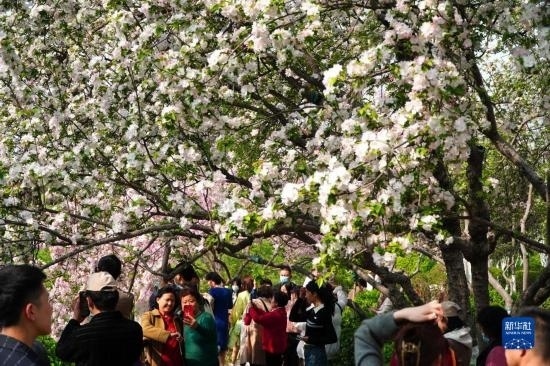 3月21日,在濟南市五龍?zhí)豆珗@,人們在觀賞盛開的海棠花。