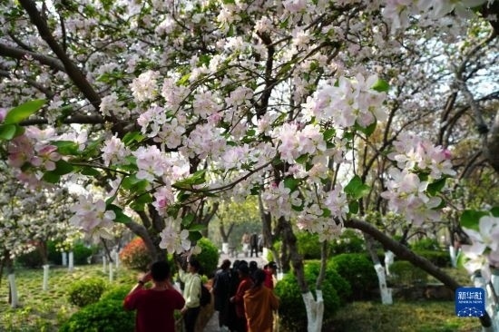 3月21日,在濟南市五龍?zhí)豆珗@,人們觀賞盛開的海棠花。
