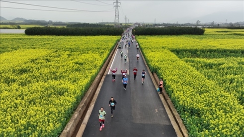 來(lái)自海內(nèi)外的1萬(wàn)余名專(zhuān)業(yè)運(yùn)動(dòng)員和馬拉松愛(ài)好者在云南羅平縣的花海中奔跑。何新文攝