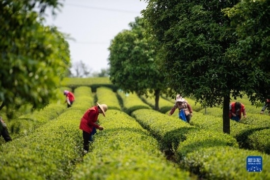 4月11日,在長沙望城烏山貢茶基地,茶農(nóng)采摘春茶(無人機(jī)照片)。
