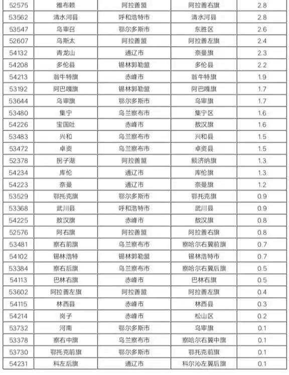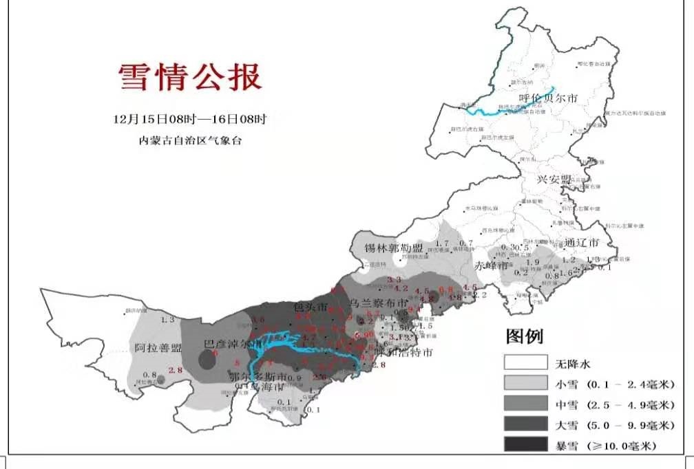 中雪:15個(gè)旗縣共16個(gè)站出現(xiàn)中雪,其中,鄂爾多斯市杭錦旗伊克烏素4.9毫米、錫林郭勒盟太仆寺旗4.8毫米、烏蘭察布市化德縣4.8毫米。