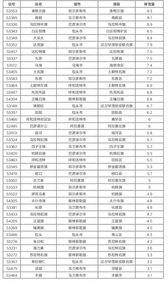 大雪:25個(gè)旗縣共27個(gè)站出現(xiàn)大雪,其中,鄂爾多斯市準(zhǔn)格爾旗9.3毫米、烏蘭察布市商都縣9.1毫米、巴彥淖爾市烏拉特中旗8.9毫米。