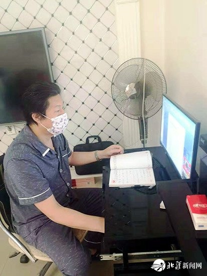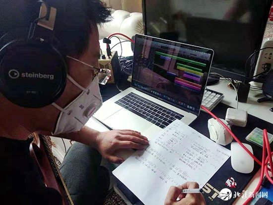 喀喇沁旗烏蘭牧騎隊(duì)長吳國輝在家中創(chuàng)作快板作品《為逆行者點(diǎn)贊》。受訪者供圖