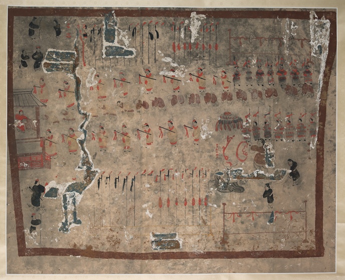 再繞回前室中層,橫跨東北西3面墓壁即是《護烏桓校尉出行圖》。墓主人所乘軺車,駕3匹黑馬,榜題“使持節(jié)護烏桓校尉”等字,主車前后有鼓車、斧車,層層環(huán)護眾多武官、兵丁,隨從有“別駕從事”“功曹從事”“校尉行部”等下屬官職,連車列騎,旗旌飄揚,場面極為壯觀。中室東壁下半部描繪的是《寧城圖》與《護烏桓校尉幕府圖》。《寧城圖》畫有城垣、城門、衙署等內(nèi)容,其中寧城南門外武士持戟列隊、身著胡服的少數(shù)民族人物徐徐入內(nèi)的場景最為突出。占據(jù)主畫面的是《護烏桓校尉幕府圖》,由于任護烏桓校尉官職是墓主人一生中最值得炫耀的經(jīng)歷,所以,此圖描繪得最為詳細夸張,是整個壁畫中的核心部分。整個幕府分為堂院、營舍和庖舍3個部分,堂屋為高大的廡殿式房屋,墓主人端坐堂上,堂下藝人在表演樂舞雜耍,少數(shù)民族人物伏拜覲見,周圍環(huán)立官吏武士,場面喧囂隆重。營舍位于幕府后院,是幕府中管理軍務(wù)的機構(gòu)所在,庖舍位于幕府的西南角,掌管幕府廚飲之事。