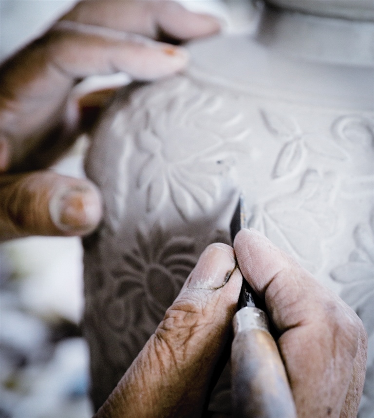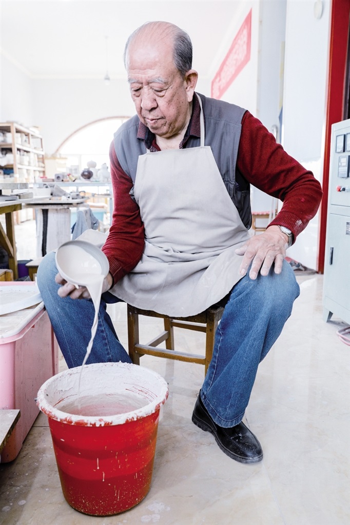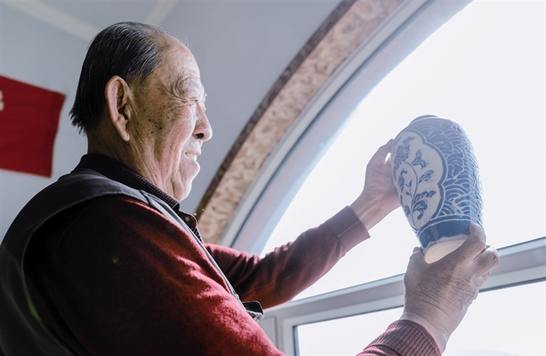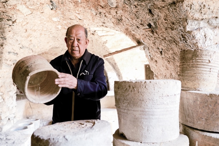 隨后,他走進(jìn)“饅頭窯”旁邊的一口窯洞,這是當(dāng)時(shí)張家的一間手工作坊,揉泥、拉坯、上釉等一系列制作陶瓷的工序都是在這里完成。“我就出生在這個(gè)村子,已經(jīng)是張家瓷藝的第九代傳人了。作為中國(guó)磁州窯譜系,清水河黑礬溝瓷藝生產(chǎn)歷史至少已有800年?!标P(guān)于這項(xiàng)非遺的歷史故事,張選老人向記者娓娓道來:大約400年前,他們張家走西口從山西來到清水河謀生,當(dāng)時(shí)清水河黑礬溝有一家姓杜的人家做陶瓷營(yíng)生,張家的先人在杜家打工,大概這樣打工做了三輩人吧,杜家忽然不做了,搬離了黑礬溝,他們張家便把杜家的產(chǎn)業(yè)買了下來繼續(xù)做?!澳莻€(gè)時(shí)候黑礬溝生產(chǎn)的瓷器都與人們生活息息相關(guān),比如腌菜缸、水甕、碗盤等,一個(gè)家庭手工作坊一天能生產(chǎn)500個(gè)碗呢,生意很好,人們靠做這個(gè)營(yíng)生也過上了不錯(cuò)的生活。”張選回憶著清水河瓷藝鼎盛時(shí)期的場(chǎng)景。上個(gè)世紀(jì)70年代,由于交通、技術(shù)等原因,黑礬溝燃燒了幾百年的窯火熄滅,傳統(tǒng)“饅頭窯”被正式廢棄,轉(zhuǎn)移到窯溝鄉(xiāng)后手工作坊變成了機(jī)械化生產(chǎn),這也讓清水河的陶瓷名聲大噪。當(dāng)時(shí),在窯溝鄉(xiāng)一帶,從事陶瓷生產(chǎn)的有近萬人,陶瓷業(yè)成為清水河支柱產(chǎn)業(yè)。