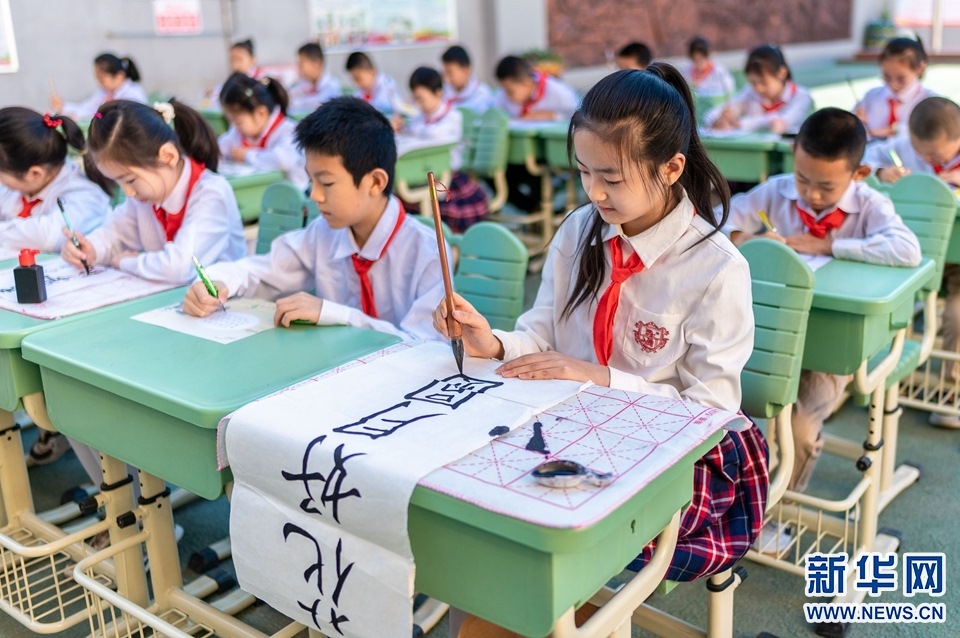 9月7日,呼和浩特市玉泉區(qū)恒昌店巷小學(xué)學(xué)生在書寫中秋詩詞佳句。新華網(wǎng)發(fā)(丁根厚攝)