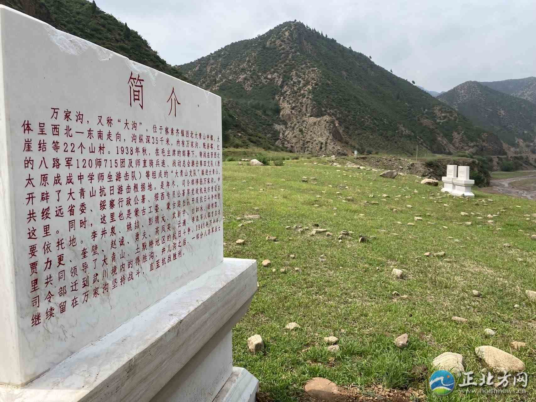 入溝不久,在綠草如茵的山坡上,就可以眺望到遠處已經(jīng)廢棄的民房,有幾十年前的老房子,也有建筑時間不長的,眼前的一切讓人恍惚,仿佛剛剛還在上演煙火氣息的鄉(xiāng)村生活。在這里矗立著寫有“萬家溝革命遺址”的漢白玉紀(jì)念碑,這是土左旗文物保護中心副主任高鷹和同事們半年前安放的。從這里,萬家溝革命遺址的探訪正式開始。