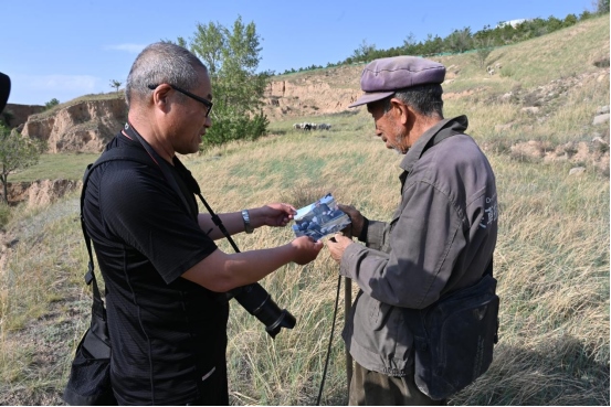 鏡頭見(jiàn)證滄桑,筆尖記錄百姓。這些年,只要疫情緩解,長(zhǎng)城人沒(méi)有停下腳步,而是一次又一次去看長(zhǎng)城、看邊堡、看邊墻下的鄉(xiāng)親們。車(chē)靜靜地行駛在空曠、蒼涼的長(zhǎng)城腳下,76歲的牧羊人呂三良正在長(zhǎng)城邊牧羊。2022年5月24日,呼和浩特市長(zhǎng)城科普學(xué)會(huì)會(huì)員追隨牧羊人的腳步,把照片送到呂三良手中,看著老人端詳著照片里的自己,會(huì)員們特別滿足。這,難道就不是一個(gè)攝影人的長(zhǎng)城情懷、百姓情懷嗎?(郭雁平 高曉梅)