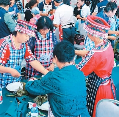 圖為京臺兩地同胞一同體驗(yàn)包粽子。北京市臺辦供圖