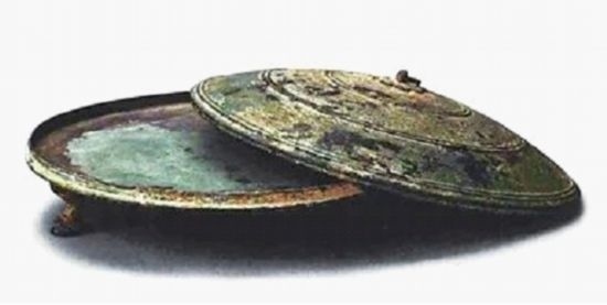 青銅鏊由蓋和體兩部分組成,蓋呈傘狀,上飾兩組弦紋,頂部有一橋形鈕,鈕下飾以梅花形飾片,鈕上套一圓形提環(huán)。體為圓形淺盤,平底,下附三蹄足。蓋周邊有和鏊面扣合的子母口,上下合體十分嚴(yán)密。據(jù)考證,這是我國(guó)考古發(fā)現(xiàn)最早的帶蓋青銅鏊,是研究古代飲食文化的珍貴實(shí)物資料。