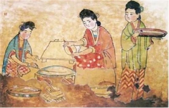 2003年,河南省登封市高村發(fā)掘了一座宋代壁畫墓,其中的“烙餅圖”非常生動(dòng)寫實(shí)。畫中有3位女子,左側(cè)女子正在鏊子前持物翻餅,其右置一圓盒,內(nèi)有烙好的煎餅。鏊子呈穹廬狀鼓起,同現(xiàn)在常見(jiàn)的鐵鏊無(wú)異。中間女子正在矮案前持兩頭尖、中間粗的搟面棍搟制面皮。右側(cè)女子雙手托盤,似走卻又回首觀望。整幅壁畫色彩艷麗,人物各具情態(tài),栩栩如生。