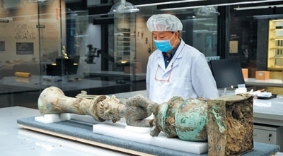 數(shù)字采集考古人員在實(shí)驗(yàn)室,對(duì)三星堆出土文物進(jìn)行高光譜掃描。廣漢市委宣傳部供圖