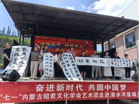 據(jù)了解,本次進社區(qū)活動由內(nèi)蒙古昭君文化學會、清水河縣城關鎮(zhèn)政府、昆新社區(qū)主辦,活動以“鑄牢中華民族共同體意識,構筑中華民族共有精神家園”和慶祝中國共產(chǎn)黨建黨103周年為主旨,以書法、歌舞等群眾喜聞樂見的藝術形式,歌頌中國共產(chǎn)黨帶領全國各族人民守望相助、團結奮斗砥礪前行的光輝歷程以及取得的偉大成就,真情詮釋不忘初心,牢記使命的責任擔當。