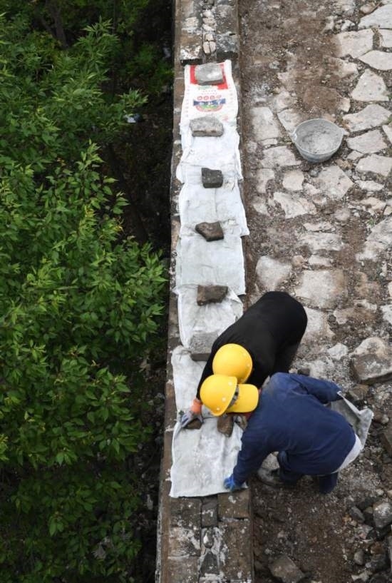 在箭扣長(zhǎng)城122號(hào)敵臺(tái)東側(cè)墻體,工人給剛剛砌好的磚蓋上編織袋遮雨(7月2日攝)。新華社記者 陳鐘昊 攝