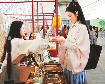 華服愛好者在二〇二四年“中國華服周·滬上繁花”國風市集上挑選飾品。新華社記者 劉 穎攝