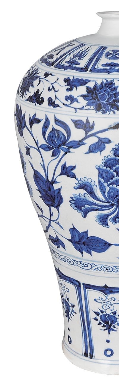 “元代的景德鎮(zhèn)制瓷匠從波斯進(jìn)口‘蘇麻離青’,也就是鈷藍(lán)料,經(jīng)高溫?zé)坪蟪尸F(xiàn)出了青花的典型色調(diào)?!别^長(zhǎng)彭國(guó)紅靠近展柜,指著梅瓶說道:“青花料濃厚處有黑褐色鐵銹瑕疵,是因?yàn)檫@種原料中含有金屬元素,這是元代青花制品的特點(diǎn)之一?!?/p>