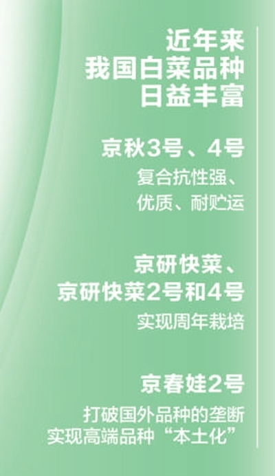 近年來(lái),我國(guó)白菜育種實(shí)力突飛猛進(jìn),品種日益豐富,實(shí)現(xiàn)了從單一“秋播冬貯”向優(yōu)勢(shì)產(chǎn)區(qū)生產(chǎn)、產(chǎn)品多樣化和周年生產(chǎn)轉(zhuǎn)變。培育出了復(fù)合抗性強(qiáng)、優(yōu)質(zhì)、耐貯運(yùn)的品種“京秋3號(hào)、4號(hào)”等,高品質(zhì)、速生苗用品種“京研快菜、京研快菜2號(hào)和4號(hào)”3個(gè)品種搭配實(shí)現(xiàn)了周年栽培,解決了生產(chǎn)上長(zhǎng)期缺乏冬春和夏季栽培專用品種的難題。還育成了娃娃菜、快菜、紹菜、金絲白等高品質(zhì)品種,尤其是“京春娃2號(hào)”一舉打破國(guó)外品種的壟斷,它比國(guó)外品種早熟5至7天,種植密度高25%,畝收入增長(zhǎng)30%,已成為國(guó)產(chǎn)娃娃菜第一大品種,實(shí)現(xiàn)了高端品種的“本土化”。