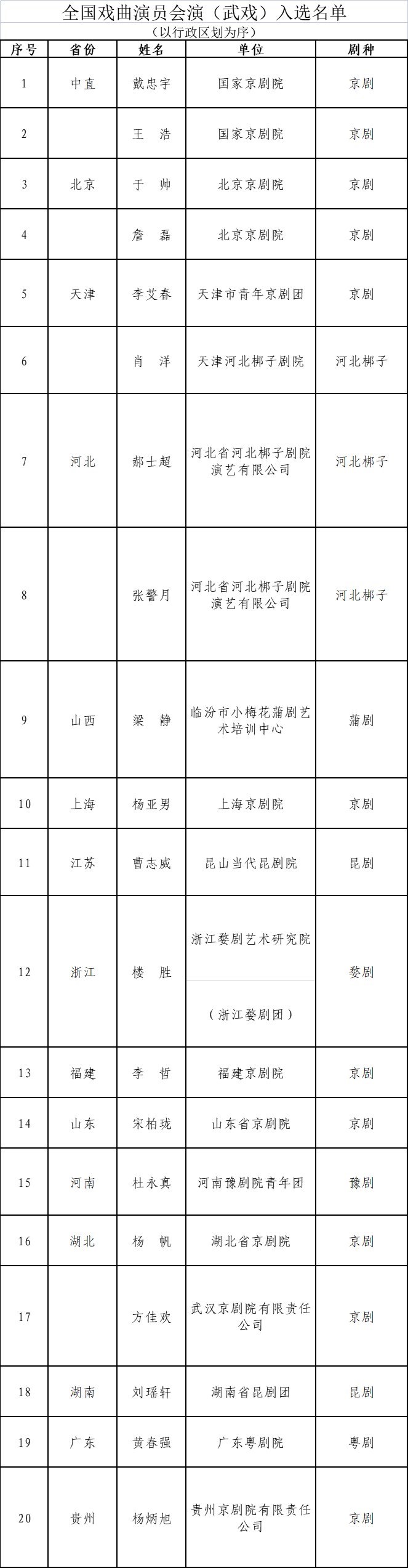 人民網(wǎng)北京3月25日電 (記者楊虞波羅)據(jù)文化和旅游部官網(wǎng)消息,日前,全國戲曲演員會演(武戲)遴選和公示工作已結(jié)束?,F(xiàn)將入選名單予以公布,并就有關(guān)事項函告如下。