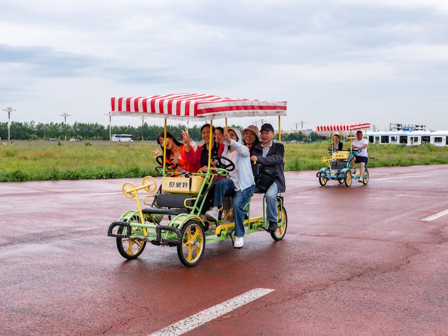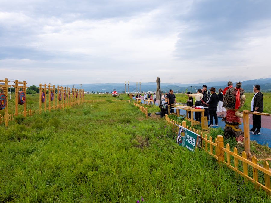 來自全國各地的游客踏過浸潤雨水的青草,在這片土地上尋覓多樣樂趣:身著盛裝的游客倚著氈房淺笑,鏡頭將服飾的明艷與草原的蒼綠定格成畫;射箭場上,游客拉弓瞄準的瞬間,風聲與周遭歡呼交織成趣;草原觀光小火車緩緩穿行,濕潤的空氣里滿是草木的清新……