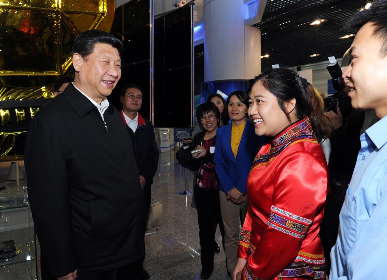 2013年5月4日,習(xí)近平和在中國空間技術(shù)研究院展廳參觀的各界優(yōu)秀青年代表交談。來源:新華社